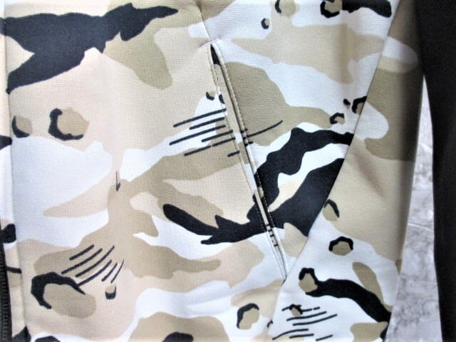 ボディのインパクトのあるカモフラージュ柄と、左袖のブランドマークがアクセントになり、コーディネートを引き立てます。